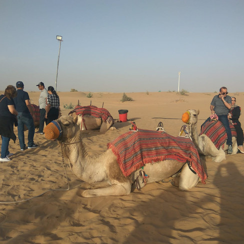 Es un paseo de día entero, depende del precio que hayas pagado el servicio es regular o Vip. Nosotros no quisimos gastar mucho y al ser 5 decidimos una opción económica, que comenzó tomando un bus muy pequeño en el estacionamiento de un Mall, haciendo muchas paradas para recoger turistas, hasta llegar por una autopista en las afueras de Dubai al desierto y ahí tomar las 4X4......los conductores demuestran su experiencia en el dune bashing sobre las dunas rojas del desierto haciendo un paseo de unos 20 minutos, que es una experiencia muy EMOCIONANTE !!!! al llegar al campamento haremos una parada para ver el atardecer, pasear en camellos, probar la shisha, degustar café árabe y hasta hacerte una foto con un águila en tu cabeza. Te ofrecen una cena sentados en alfombras en el piso, show y después regreso a casa. Es una linda experiencia pero aclaro es muy turística!!!